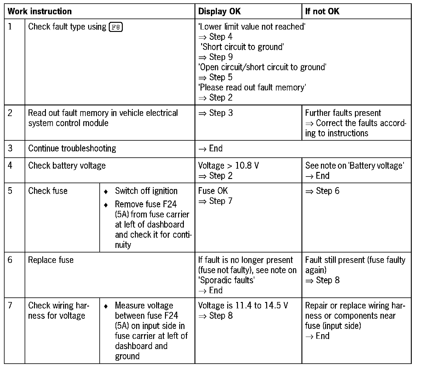 - Battery voltage: A battery voltage of between 11.4 and 14.5 V is required for the following troubleshooting procedure. This must be checked and provided, if necessary. On the vehicle electrical system, the voltage to the fuse (input side) must be guaranteed.