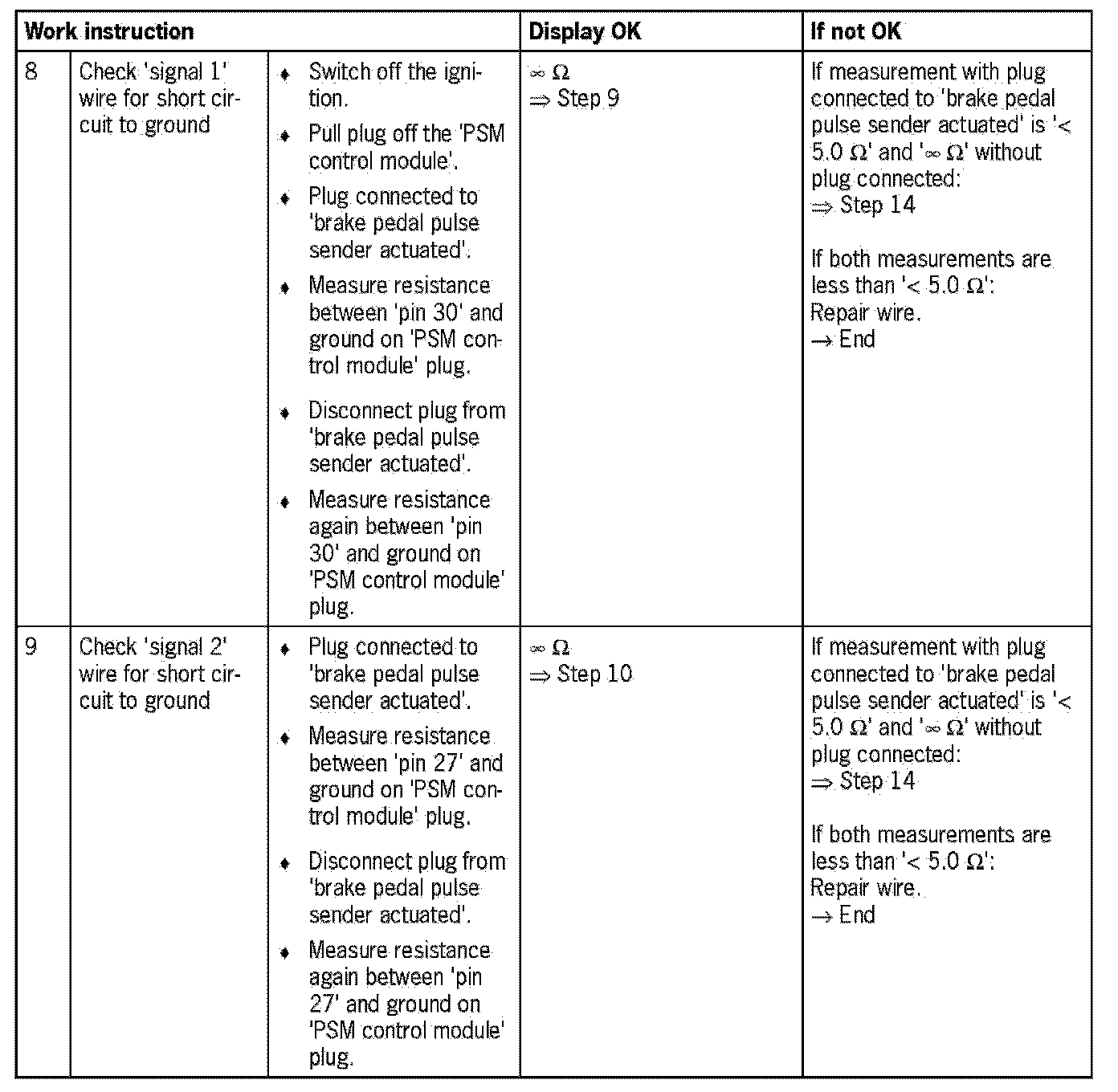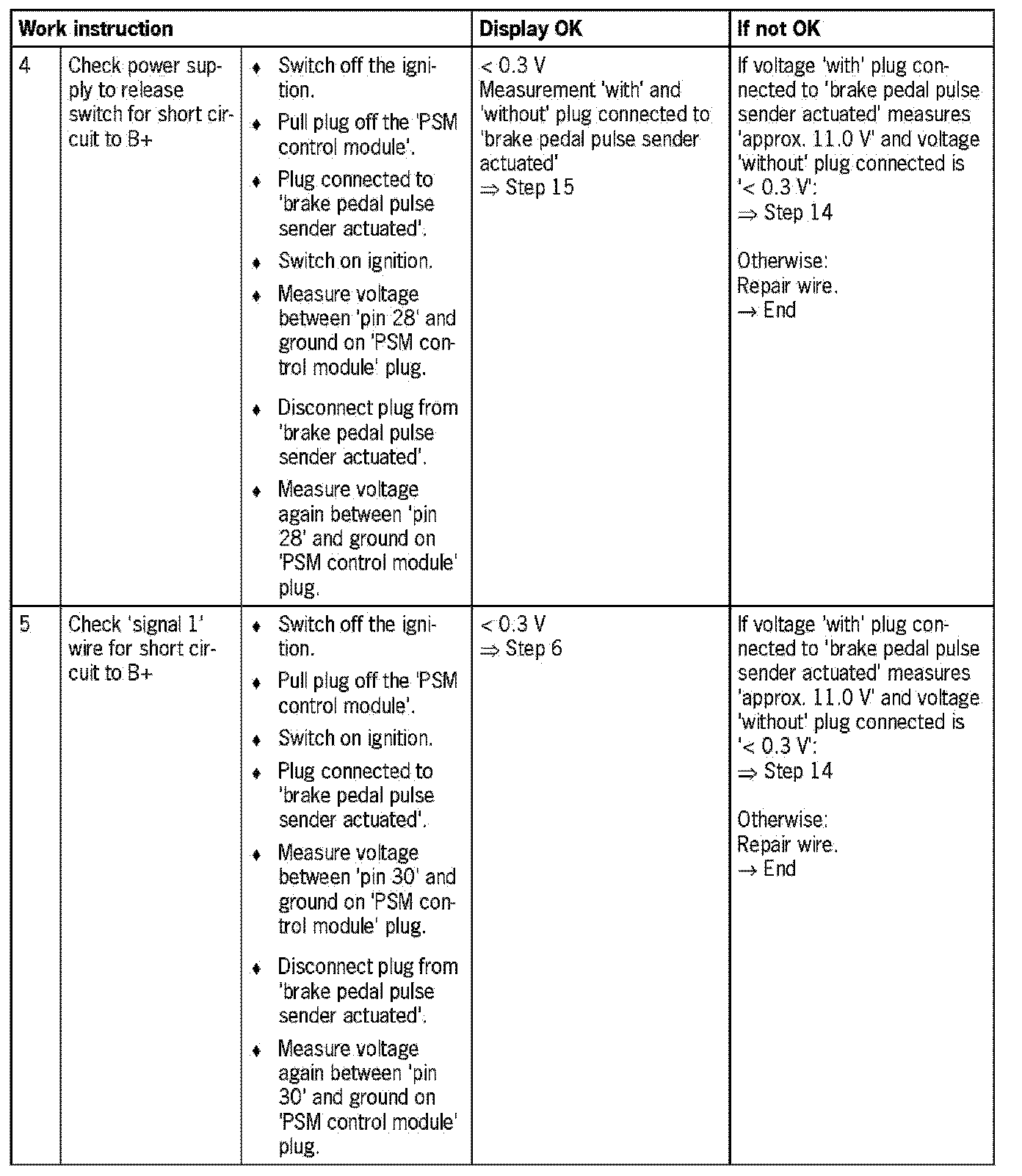 Visual inspection: In the next troubleshooting section, please check first that the affected 'pins' on the PSM control module plug connection and the 'pins' on the 'brake pedal pulse sender actuated' plug connection are neither damaged nor corroded. The wiring of the affected components must also be checked for external damage. Repair damaged or corroded pins if possible, otherwise replace affected 'pins'. Repair or replace damaged wire.