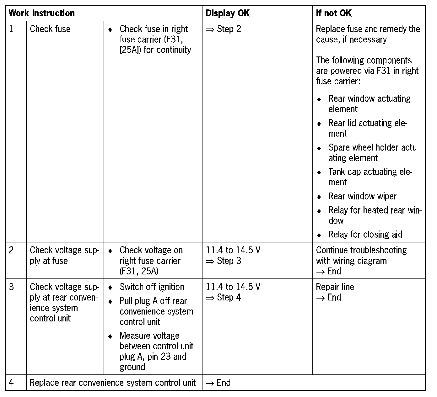 Visual inspection: In the next troubleshooting section, please check first that the affected pins on the rear convenience system control unit plug connection are neither damaged nor corroded. The wiring and plugs of the affected components must also be checked for external damage and proper contact Repair damaged or corroded pins it possible, otherwise replace affected pins. Repair or replace damaged wires.