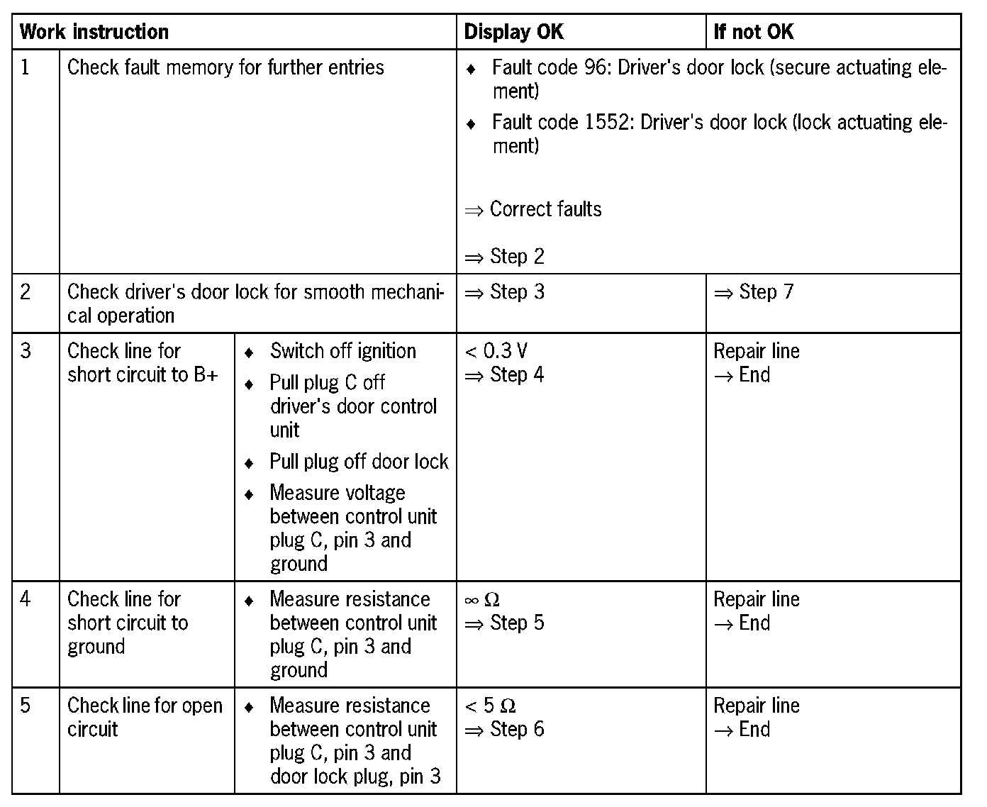 Visual inspection: In the next troubleshooting section, please check first that the affected pins on the driver's door control unit plug connection are neither damaged nor corroded. The wiring and plugs of the affected components must also be checked for external damage and proper contact Repair damaged or corroded pins it possible, otherwise replace affected pins. Repair or replace damaged wires.