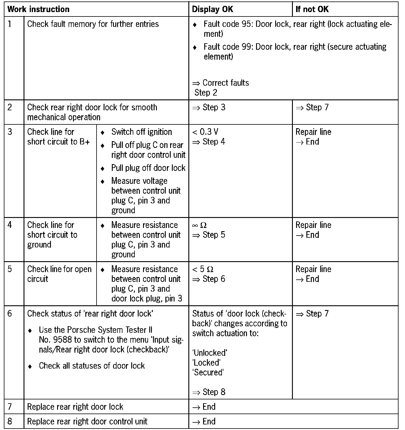 Visual inspection: In the next troubleshooting section, please check first that the affected pins on the rear right door control unit plug connection are neither damaged nor corroded. The wiring and plugs of the affected components must also be checked for external damage and proper contact Repair damaged or corroded pins it possible, otherwise replace affected pins. Repair or replace damaged wires.