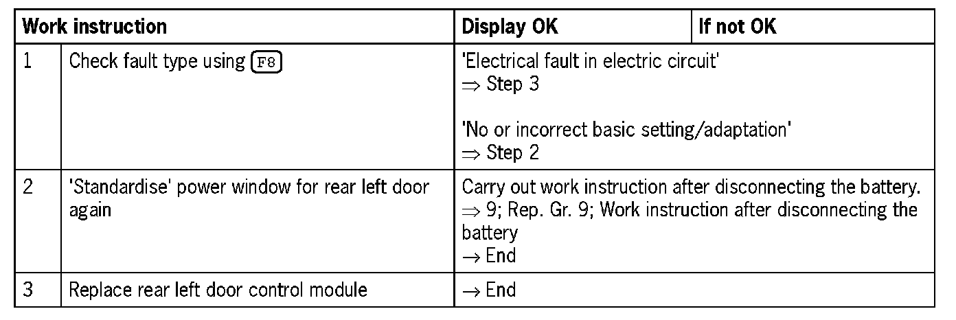 Visual inspection: In the next troubleshooting section, please check first that the affected pins on the rear left door control module plug connection are neither damaged nor corroded. The wiring and plugs of the affected components must also be checked for external damage and correct contacts. Repair damaged or corroded pins if possible, otherwise replace affected pins. Repair or replace damaged wires.