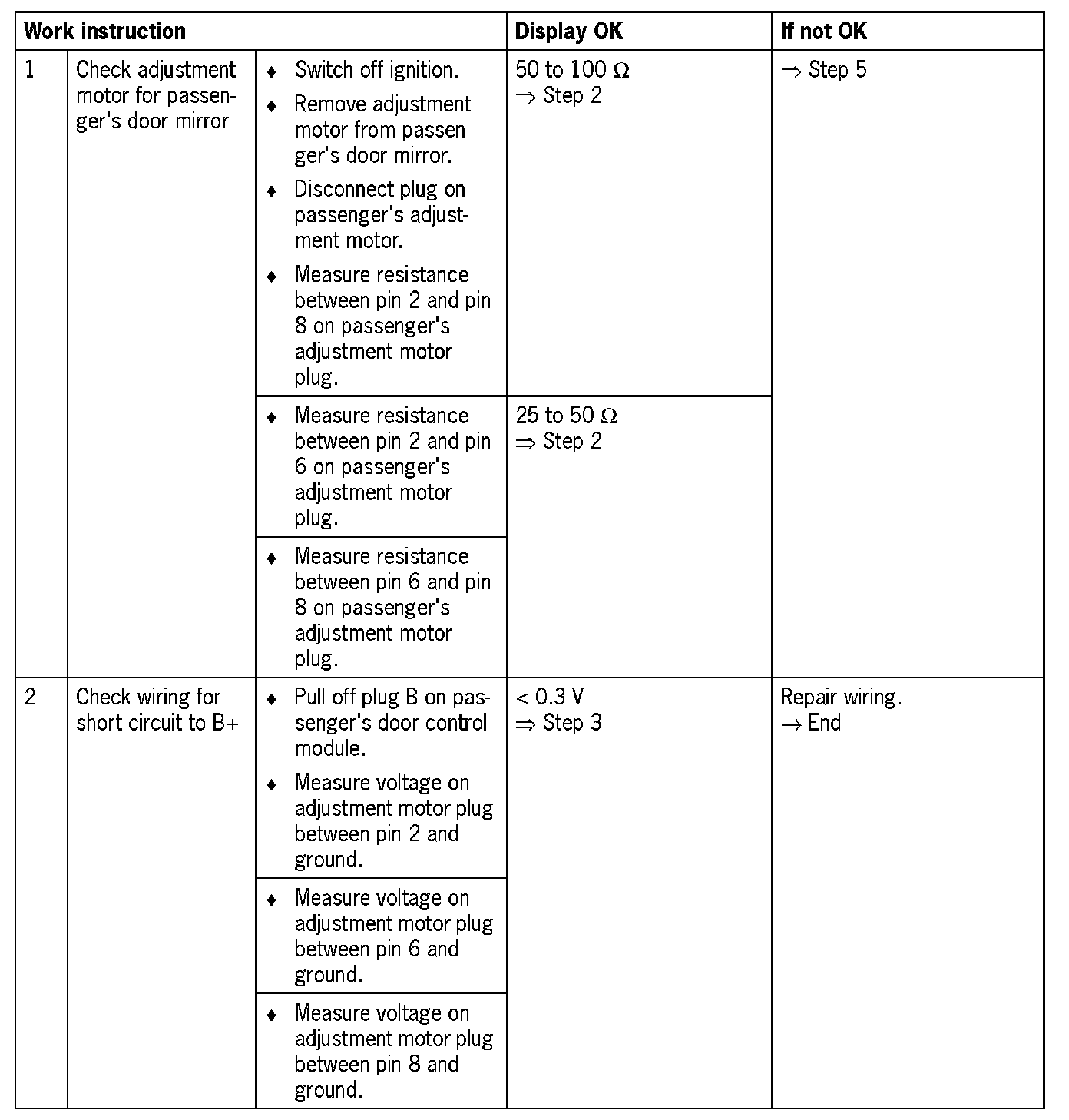 Visual inspection: In the next troubleshooting section, please check first that the affected pins on the passenger's door control module plug connection are neither damaged nor corroded. The wiring and plugs of the affected components must also be checked for external damage and correct contacts. Repair damaged or corroded pins if possible, otherwise replace affected pins. Repair or replace damaged wires.