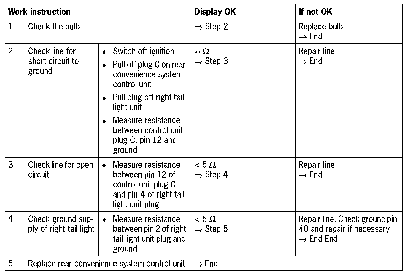 Visual inspection: In the next troubleshooting section, please check first that the affected pins on the rear convenience system control unit plug connection are neither damaged nor corroded. The wiring and plugs of the affected components must also be checked for external damage and proper contact Repair damaged or corroded pins it possible, otherwise replace affected pins. Repair or replace damaged wires.