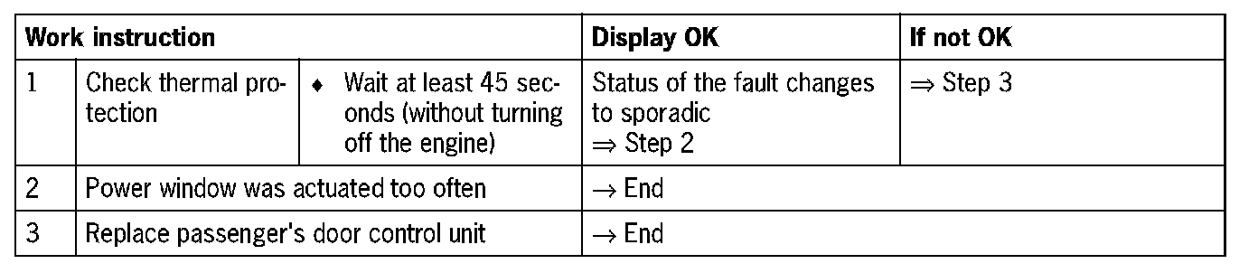Visual inspection: In the next troubleshooting section, please check first that the affected pins on the passenger's door control unit plug connection are neither damaged nor corroded. The wiring and plugs of the affected components must also be checked for external damage and proper contact Repair damaged or corroded pins it possible, otherwise replace affected pins. Repair or replace damaged wires.