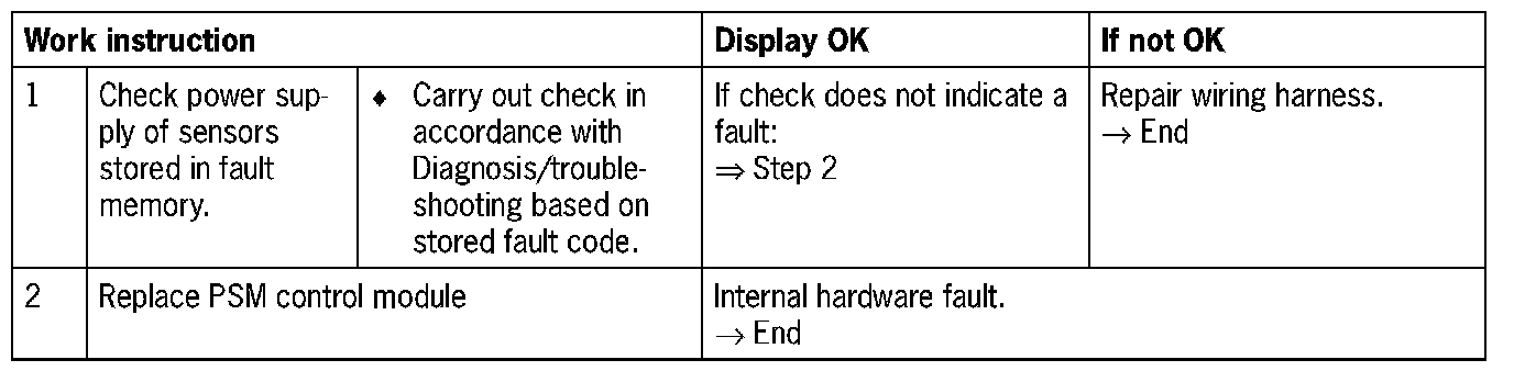 - If only fault code '1130' is stored in the fault memory, this indicates a fault in the 'PSM control module'.