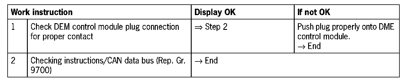 - 'No Signal/communication': DME control module not connected or CAN drive faulty