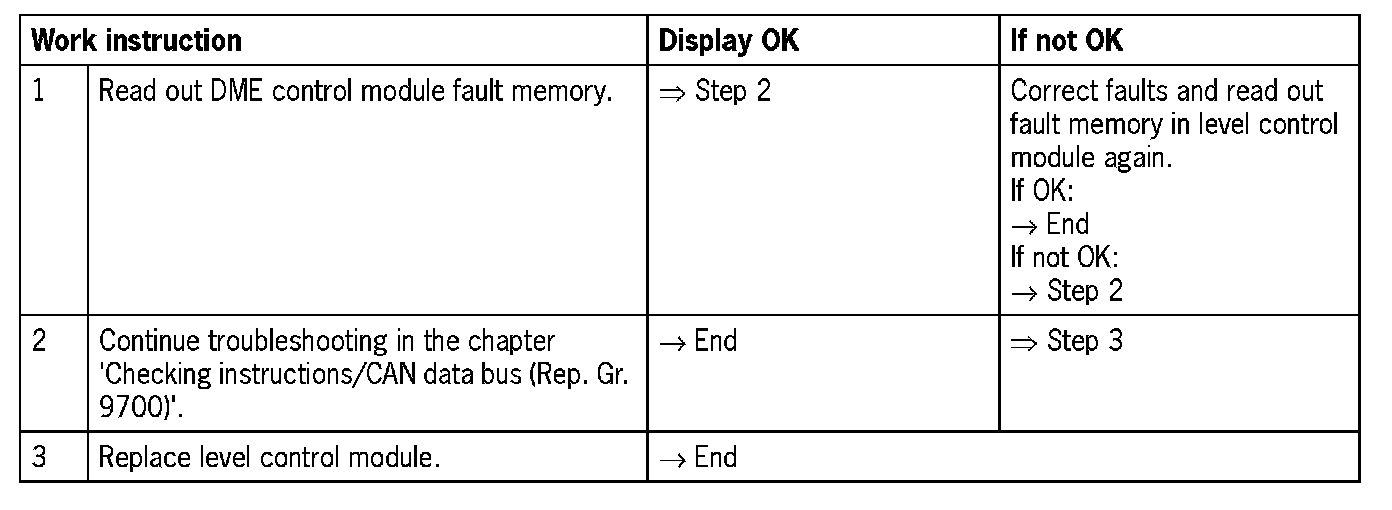 - Level control module could not establish a connection with the DME control module (no signal/communication)