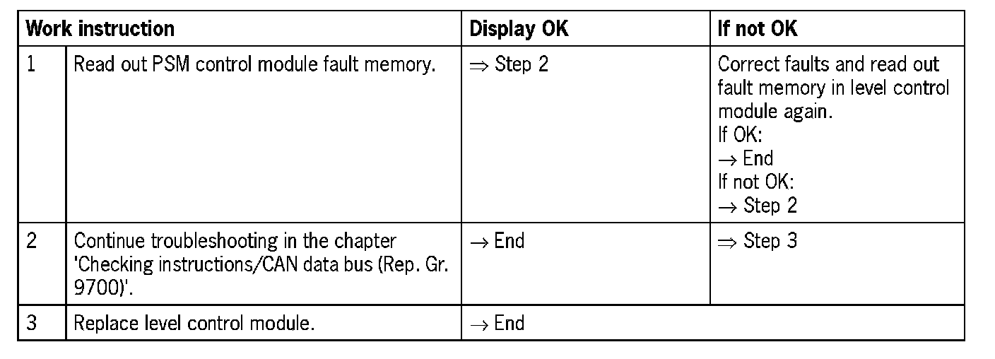 - Level control module could not establish a connection with the PSM control module (no signal/communication)