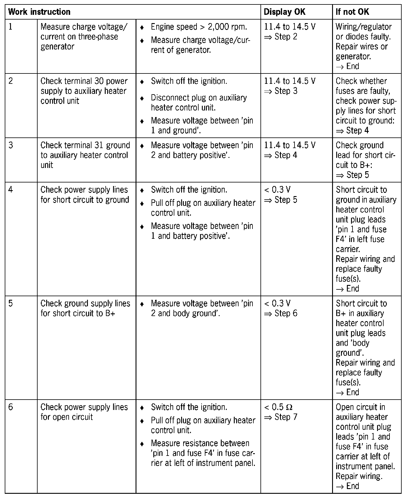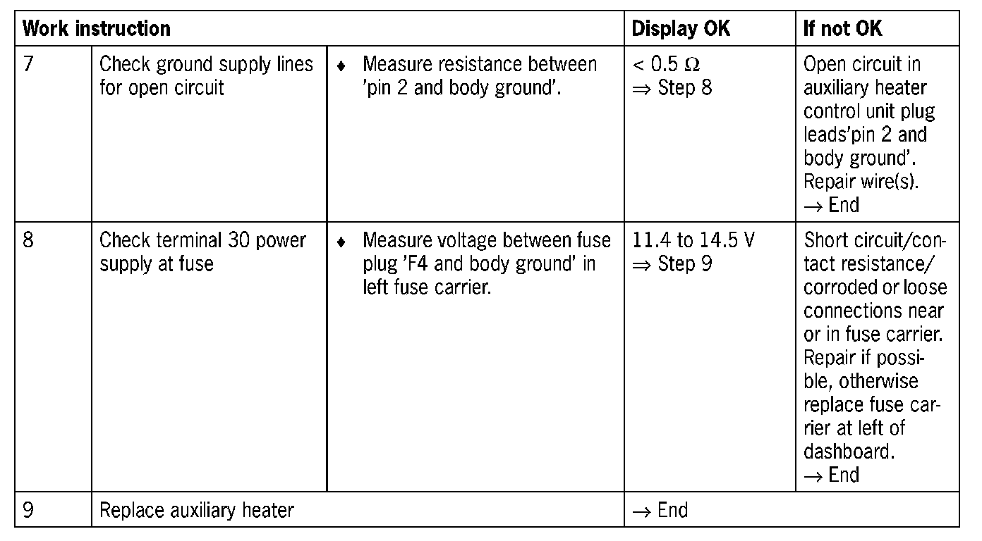 Visual inspection: In the next troubleshooting section, please check first that the affected fuses are not faulty. Replace faulty fuse(s) and determine and remedy the cause according to troubleshooting instructions. The affected pins on the auxiliary heater control unit plug connection must be neither damaged nor corroded. The wiring of the affected components must also be checked for external damage. Repair damaged or corroded pins if possible, otherwise replace affected pins. Repair damaged wire or replace.