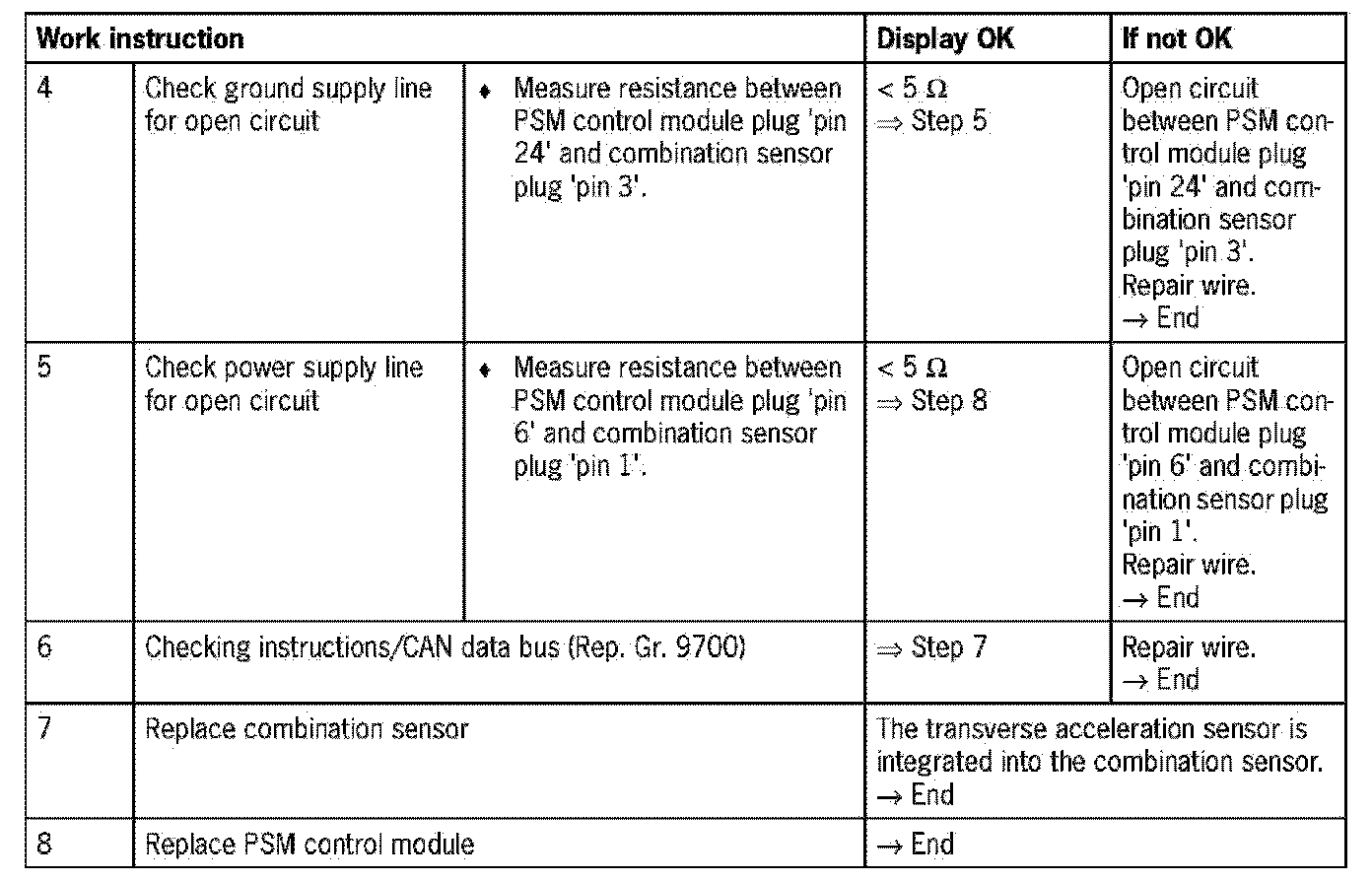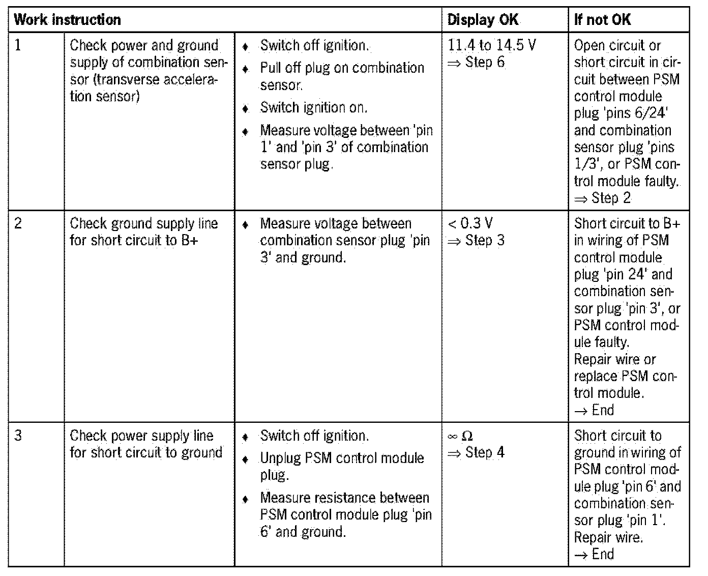 - Visual inspection: In the next troubleshooting section, please check first that the affected pins on the PSM control module plug connection and the pins on the combination sensor plug connection are neither damaged nor corroded. The wiring of the affected components must also be checked for external damage. Repair damaged or corroded pins if possible, otherwise replace affected pins repair or replace damaged wire