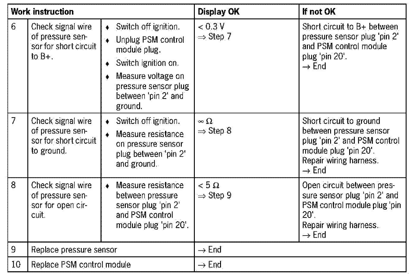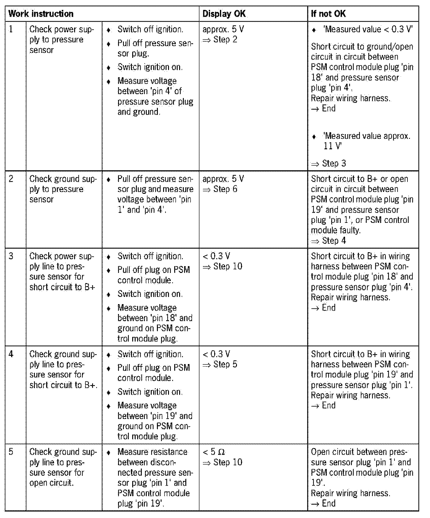 - Visual inspection: In the next troubleshooting section, please check first that the affected 'pins' on the PSM control module plug connection and the pins on the pressure sensor plug connection are neither damaged nor corroded. The wiring of the affected components must also be checked for external damage. Repair damaged or corroded pins if possible, otherwise replace affected pins. Repair or replace damaged wire.