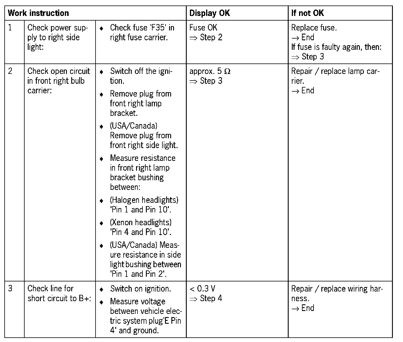 - 'Open circuit/short circuit to B+' No lighting of bulb(s) in the event of a 'disconnection', can only be diagnosed when side light is switched on.