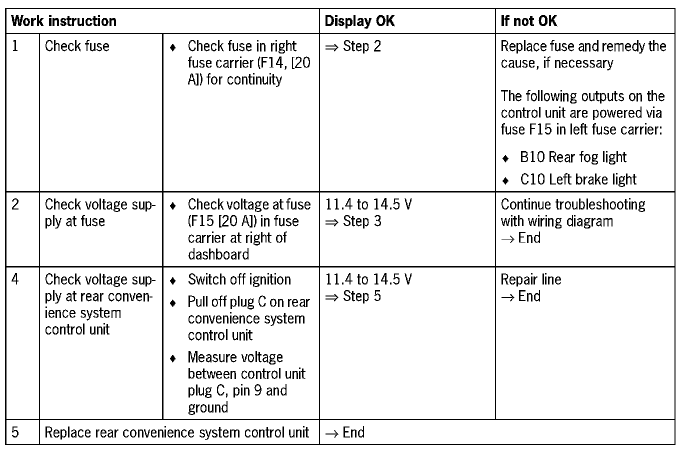 Visual inspection: In the next troubleshooting section, please check first that the affected pins on the rear convenience system control unit plug connection are neither damaged nor corroded. The wiring and plugs of the affected components must also be checked for external damage and proper contact Repair damaged or corroded pins it possible, otherwise replace affected pins. Repair or replace damaged wires.