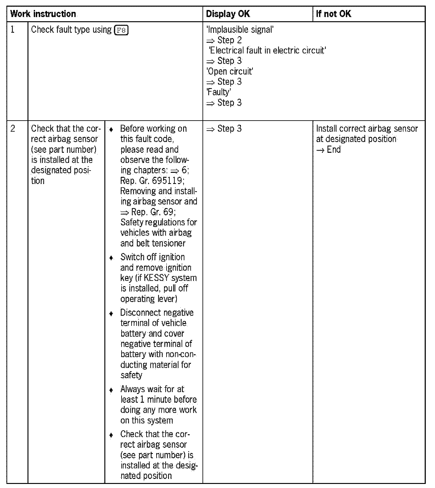 - Electrical fault in electric circuit (based on wiring between airbag triggering unit and airbag sensor; probably a short circuit to B+ or a short circuit to ground)