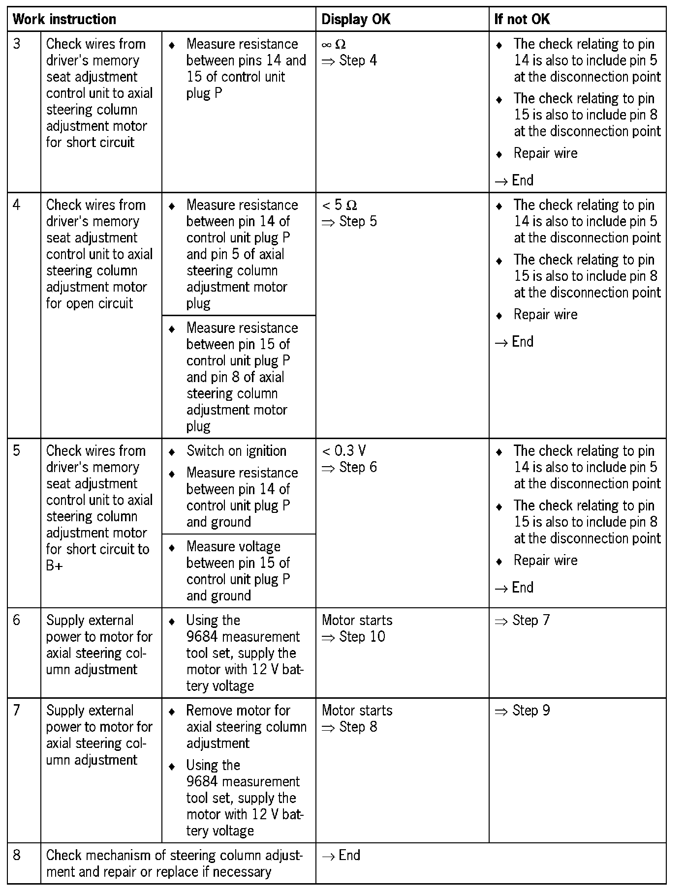 NOTE: In the wiring harness from the driver's memory seat adjustment control unit to the axial steering column adjustment motor, there is a disconnection point which must be included in the checks.