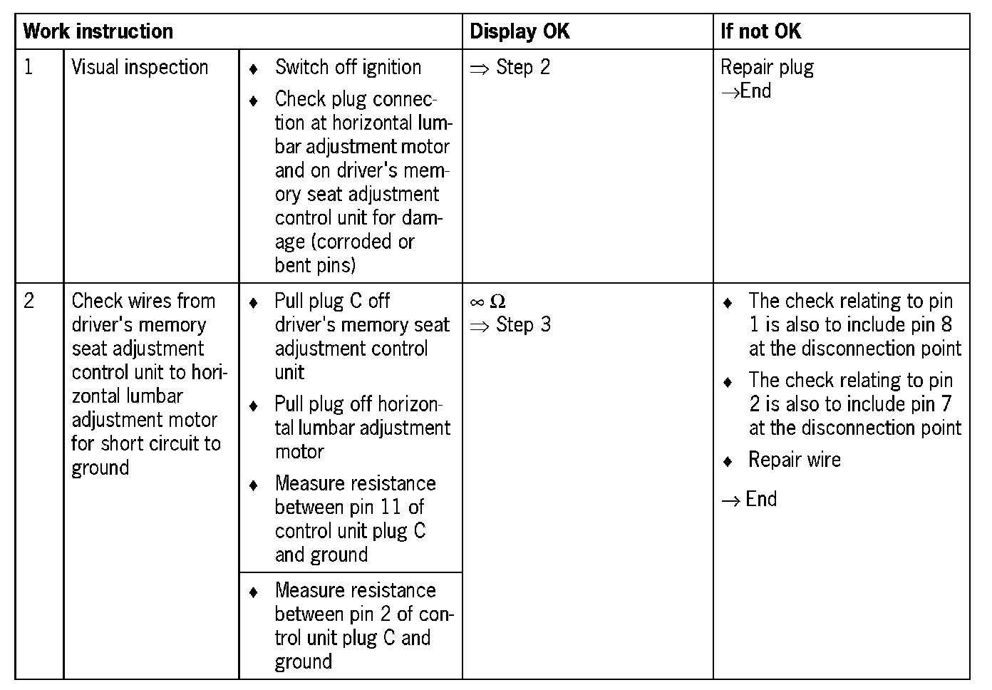 Visual inspection: In the next troubleshooting section, first check that the affected pins on the driver's memory seat adjustment control unit plug connection are not damaged or corroded. The wiring and plugs of the affected components must also be checked for external damage and correct contact. Repair damaged or corroded pins if possible, otherwise replace affected pins. Repair or replace damaged wires.