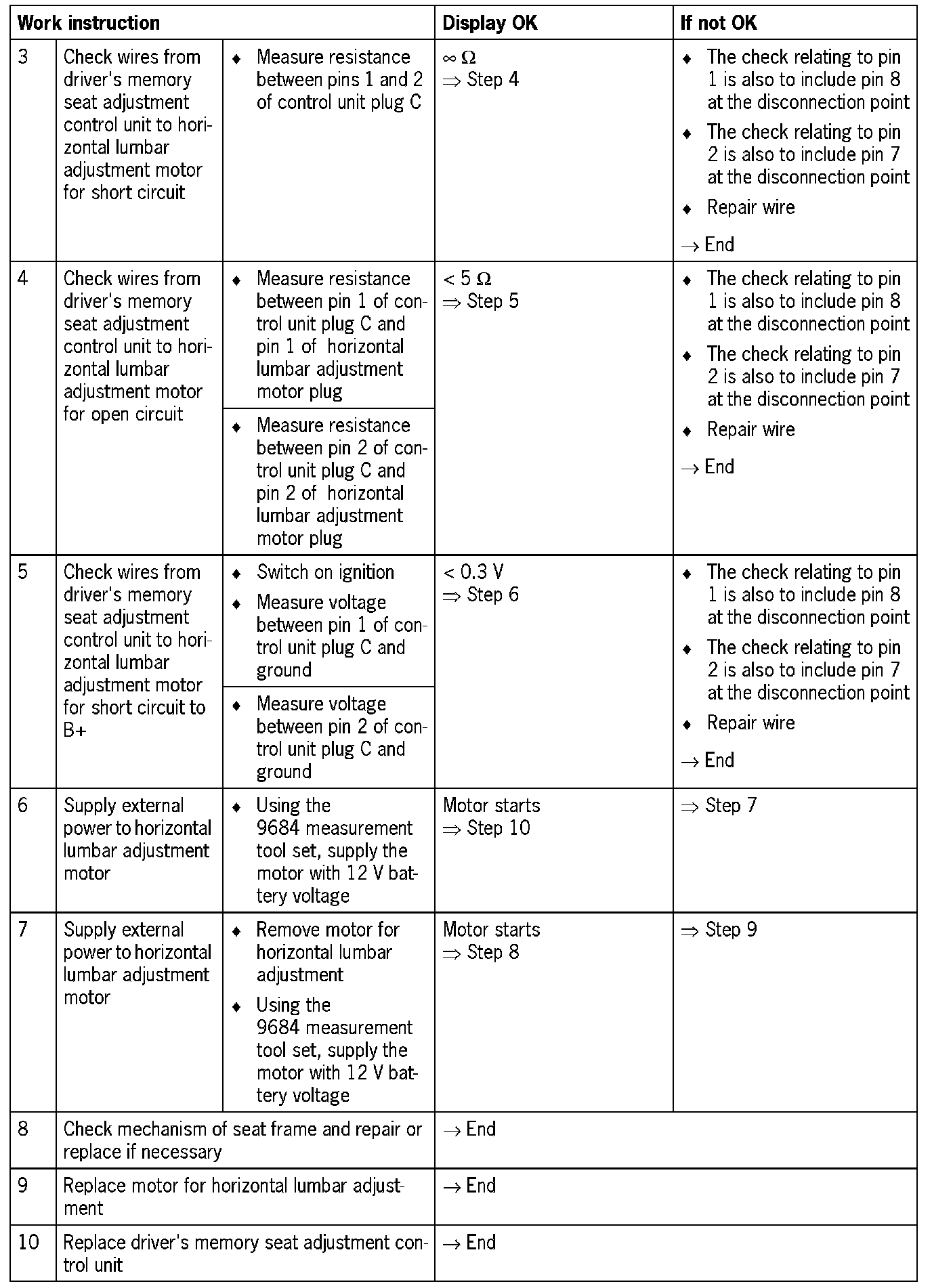 NOTE: In the wiring harness from the driver's memory seat adjustment control unit to the horizontal lumbar adjustment motor, there is a disconnection point which must be included in the checks.