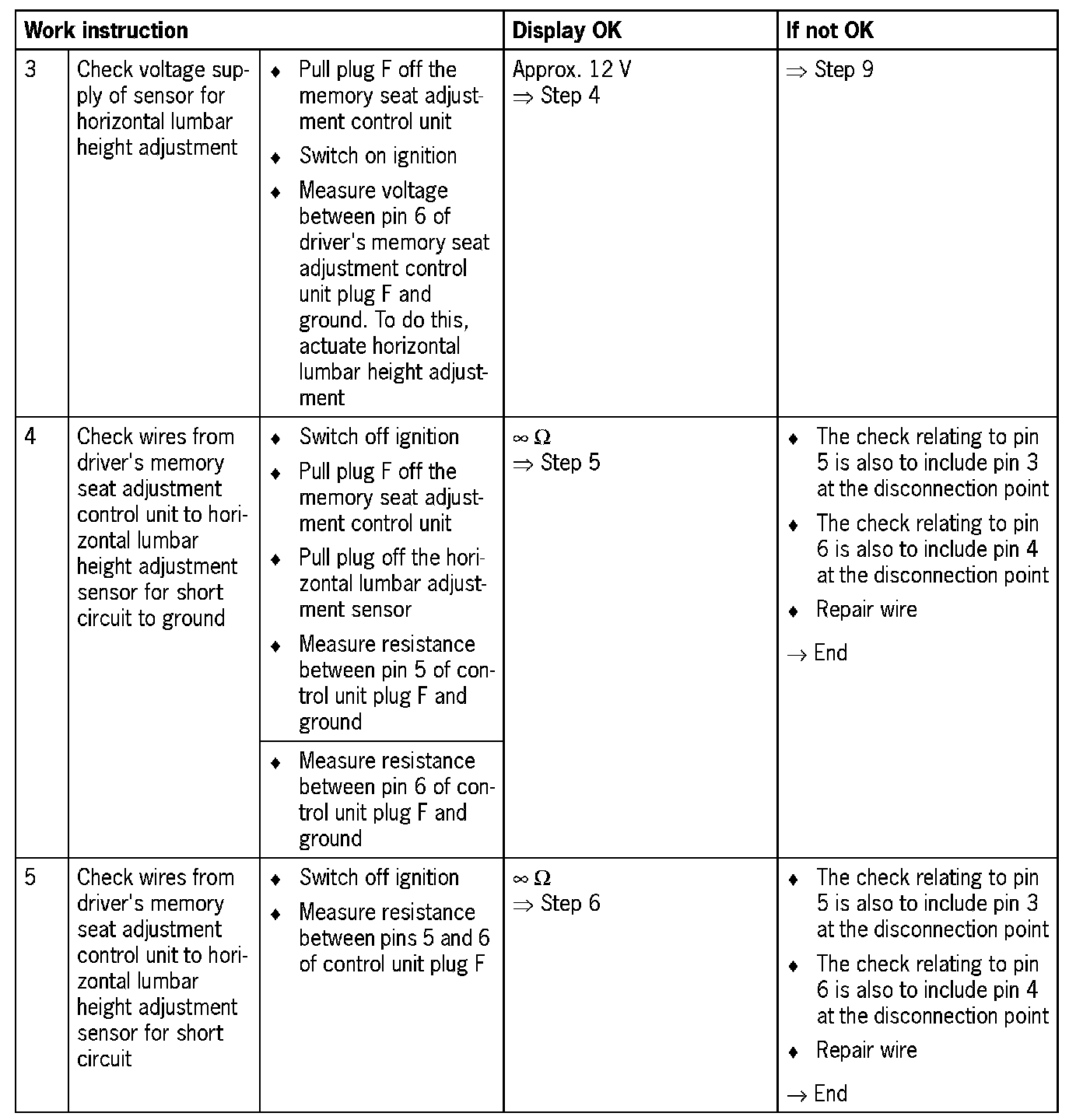 NOTE: In the wiring harness from the driver's memory seat adjustment control unit to the lumbar height adjustment sensor, there is a disconnection point which must be included in the checks.