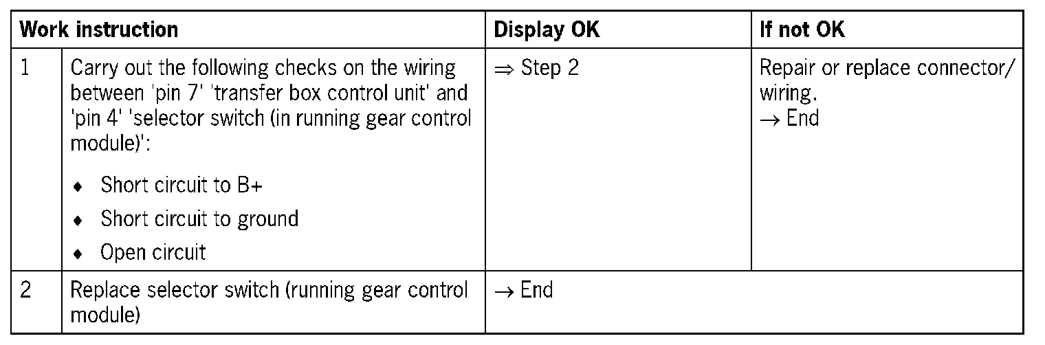 Visual inspection: In the next troubleshooting section, please check first that the affected 'pins' on the transfer box control unit plug connection and the 'pins' on the plug connections on the 'selector switch (in running gear control module)' are neither damaged nor corroded. Remove any soiling or corrosion/oxidation. Replace damaged parts/wiring.