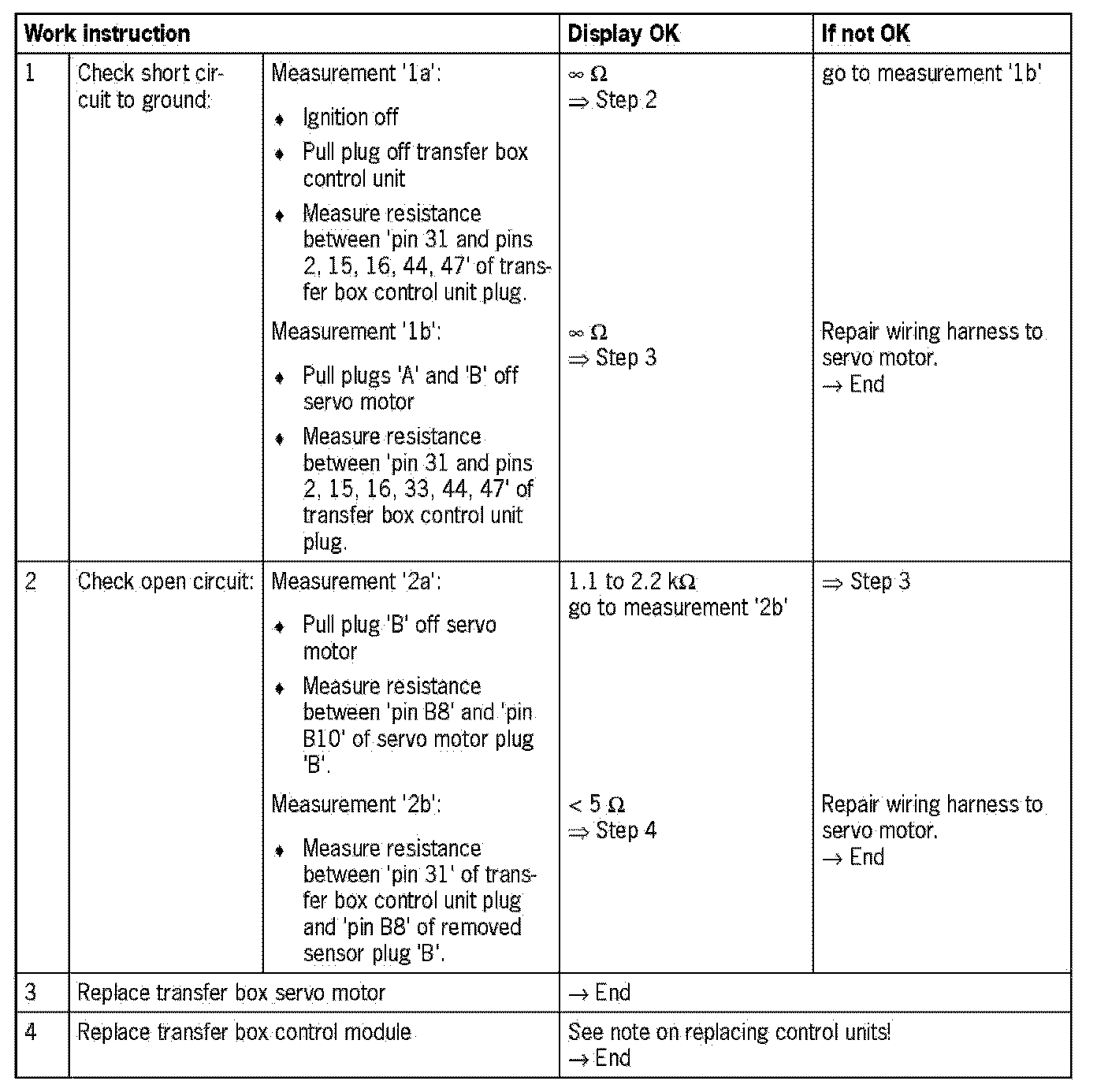 Visual inspection: In the next troubleshooting section, please check first that the affected 'pins' of the transfer box control unit plug connection and the 'pins' of the plug connections on the servo motor are neither damaged nor corroded. Remove any soiling or corrosion/ oxidation. Replace damaged parts/wires.
