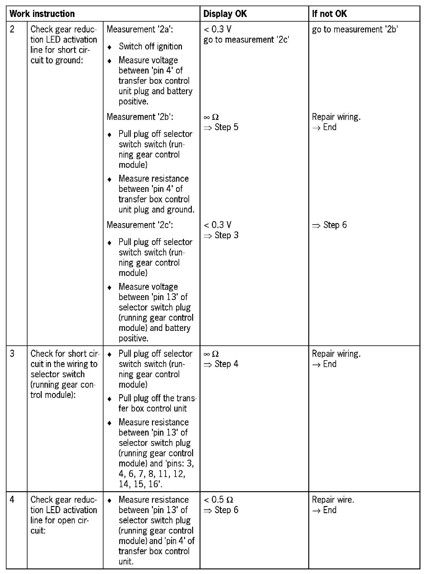 Visual inspection: In the next troubleshooting section, please check first that the affected 'pins' of the transfer box control unit plug connection and the 'pins' of the plug connections on the servo motor are neither damaged nor corroded. Remove any soiling or corrosion/ oxidation. Replace damaged parts/wires.
