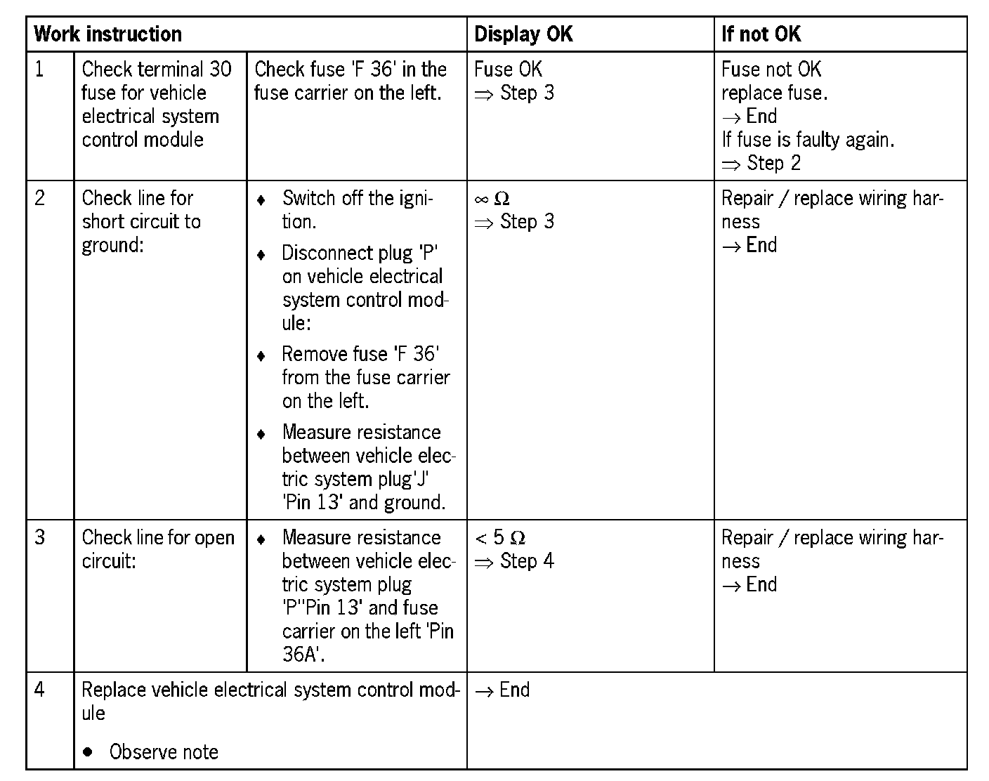 - Pin 13 'terminal 30 power supply input of vehicle electrical system control module via fuse F36 (fuse carrier at left of dashboard)'