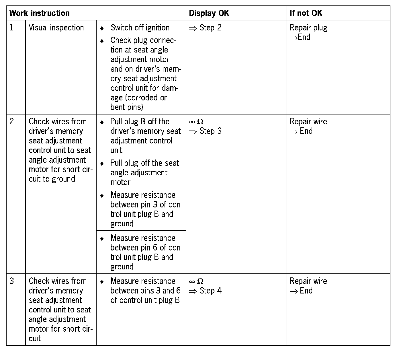 Visual inspection: In the next troubleshooting section, first check that the affected pins on the driver's memory seat adjustment control unit plug connection are not damaged or corroded. The wiring and plugs of the affected components must also be checked for external damage and correct contact. Repair damaged or corroded pins if possible, otherwise replace affected pins. Repair or replace damaged wires.