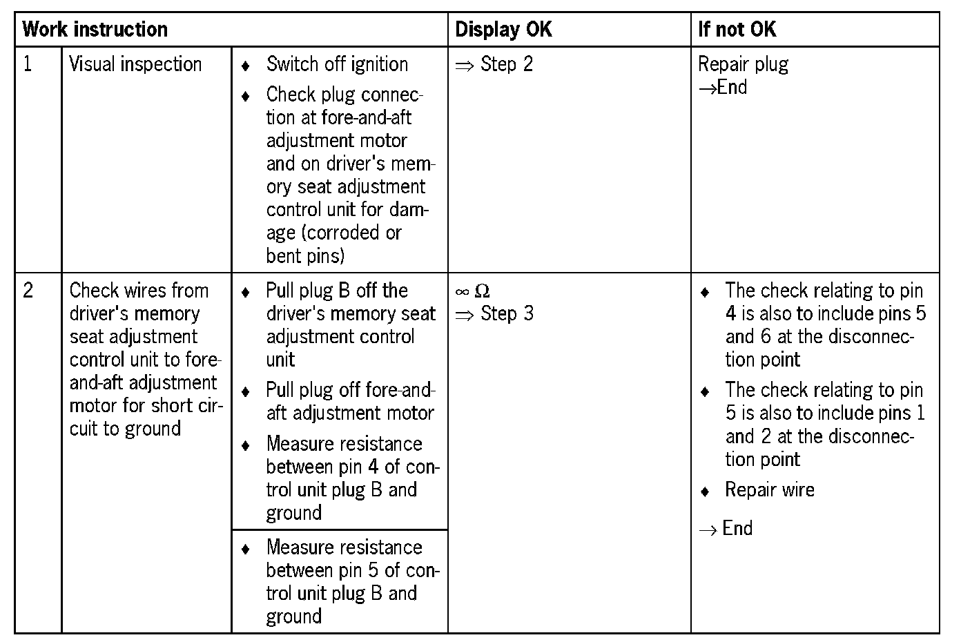 Visual inspection: In the next troubleshooting section, first check that the affected pins on the driver's memory seat adjustment control unit plug connection are not damaged or corroded. The wiring and plugs of the affected components must also be checked for external damage and correct contact. Repair damaged or corroded pins if possible, otherwise replace affected pins. Repair or replace damaged wires.