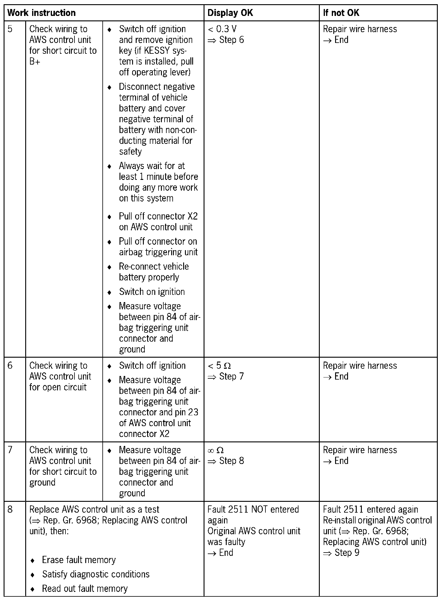 - Short circuit to B+/ground or open circuit in the wiring between the AWS control unit and the airbag triggering unit