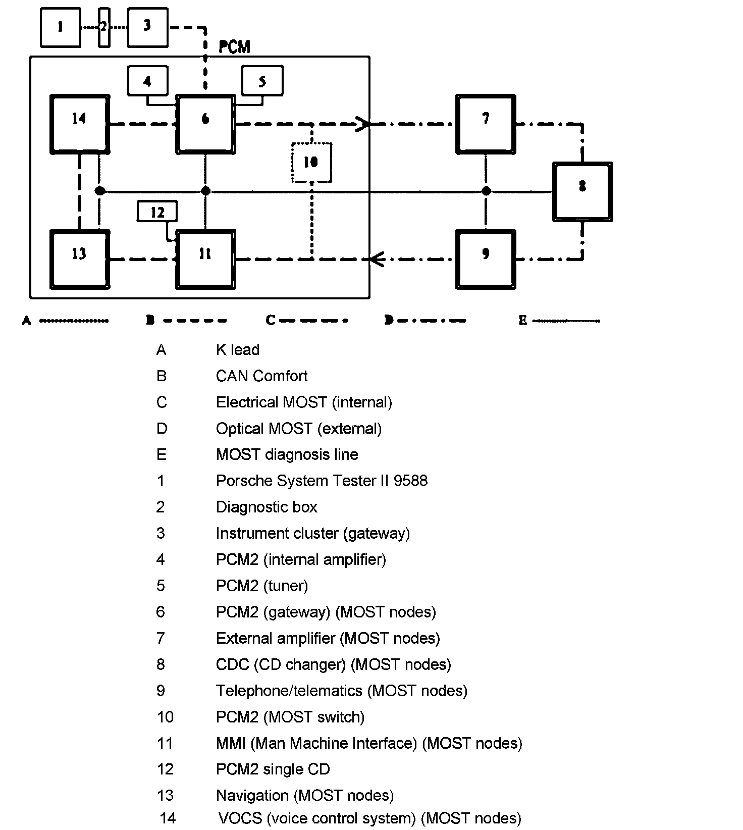 - The ring break diagnosis line and the MOST optical waveguide are connected to the following control modules: