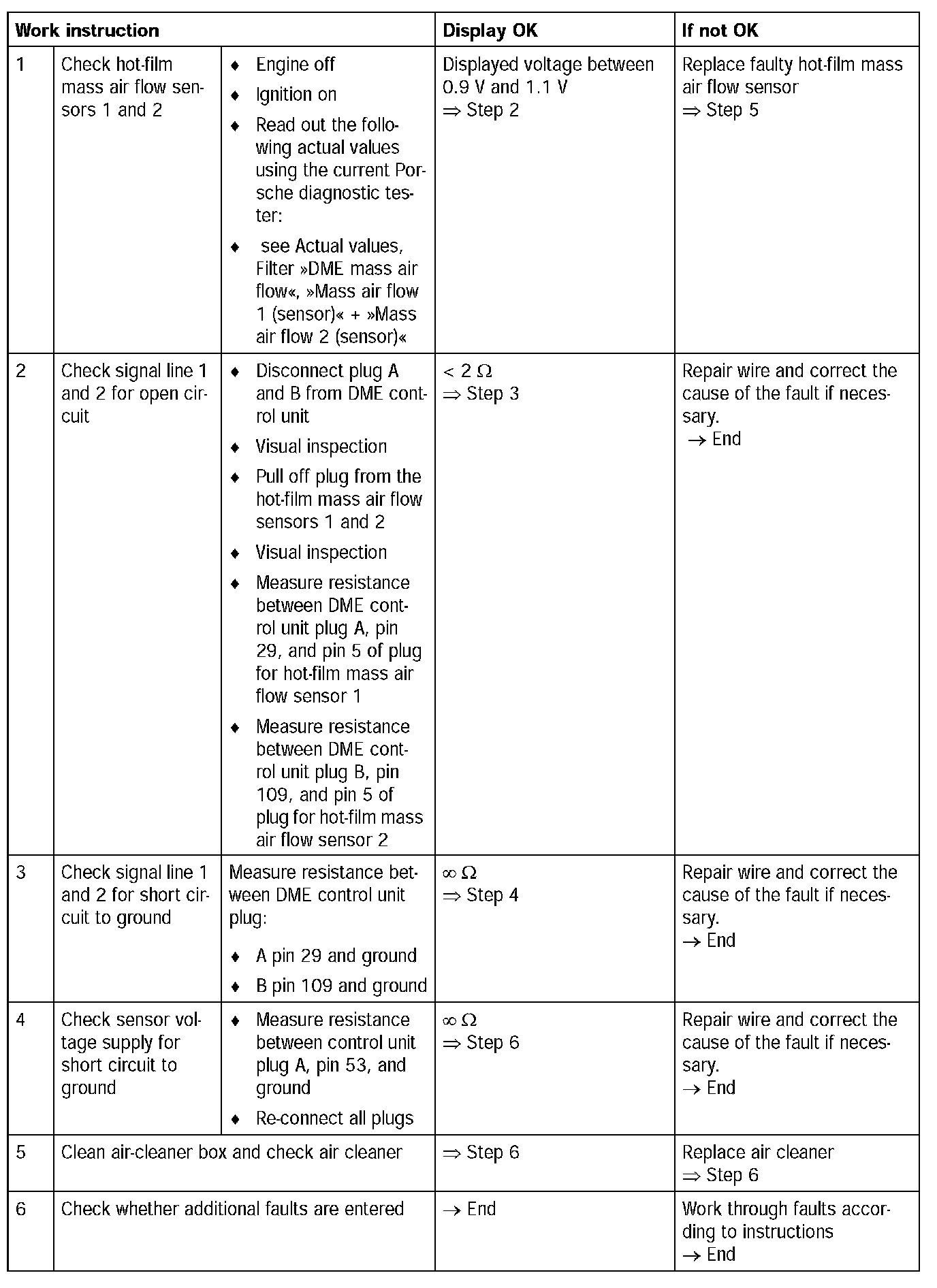 - Hot-film mass air flow sensor 1 and / or 2 faulty (setpoint voltage with stopped engine and ignition on = 0.9 to 1.1 V) --> see Actual values, Filter [[DME mass air flow]], [[Mass air flow 1 (sensor)]] + [[Mass air flow 2 (sensor)]]