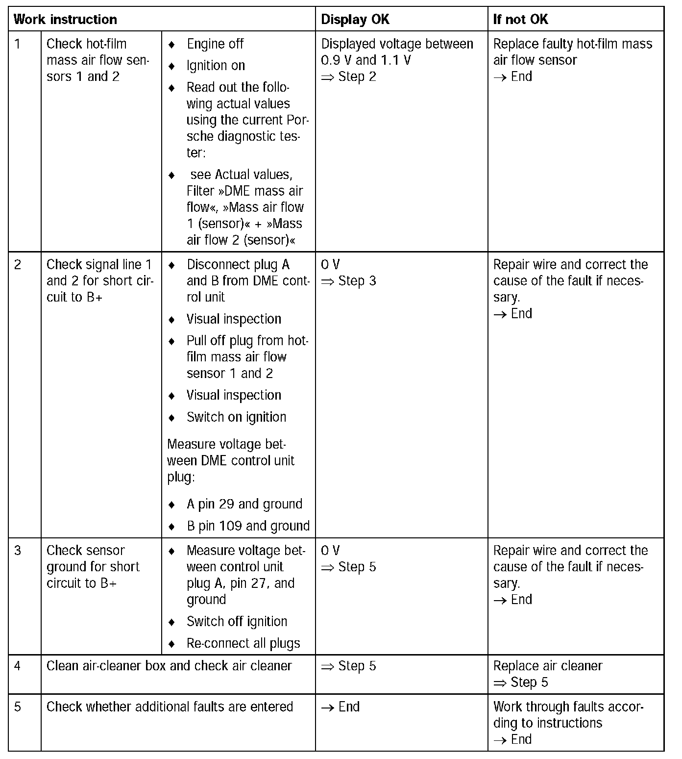 - Hot-film mass air flow sensor 1 and / or 2 faulty (setpoint voltage with stopped engine and ignition on = 0.9 to 1.1 V) --> see Actual values, Filter [[DME mass air flow]], [[Mass air flow 1 (sensor)]] + [[Mass air flow 2 (sensor)]]