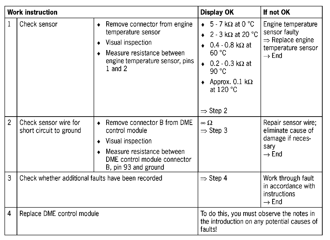 DME control module connector B, pin 93, and engine temperature sensor, pin 1