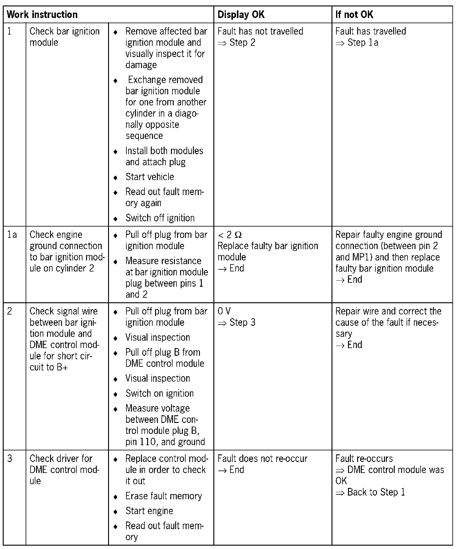 - If a fault occurs in the positive or ground supply, the bar ignition module switches the input of the signal wire (pin 4) to high resistance in order to forward the fault to the DME control module. The DME control module then enters the fault in the fault memory. The "open circuit" fault can therefore have a number of causes. It is extremely important to carry out the troubleshooting as outlined in the following table.