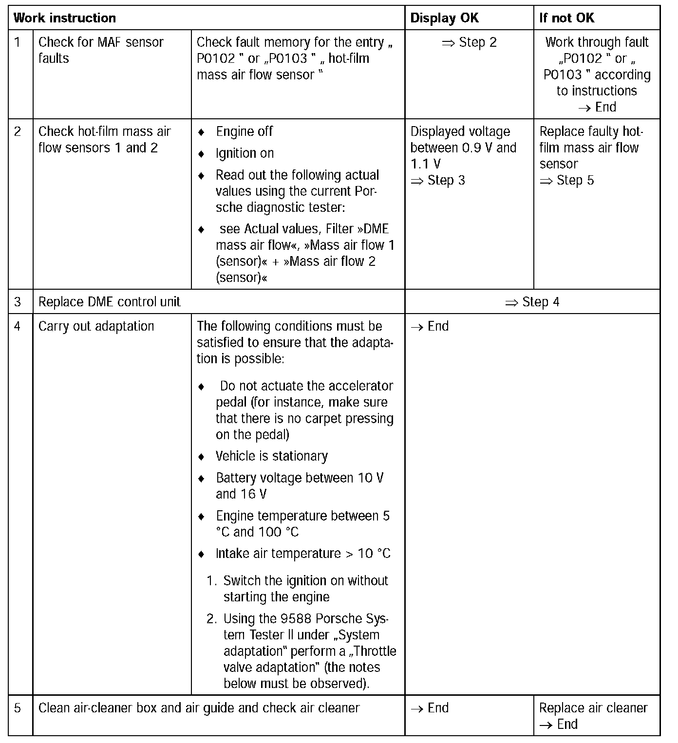 - Hot-film mass air flow sensor 1 and / or 2 faulty (setpoint voltage with stopped engine and ignition on = 0.9 to 1.1 V) --> see Actual values, Filter [[DME mass air flow]], [[Mass air flow 1 (sensor)]] + [[Mass air flow 2 (sensor)]]