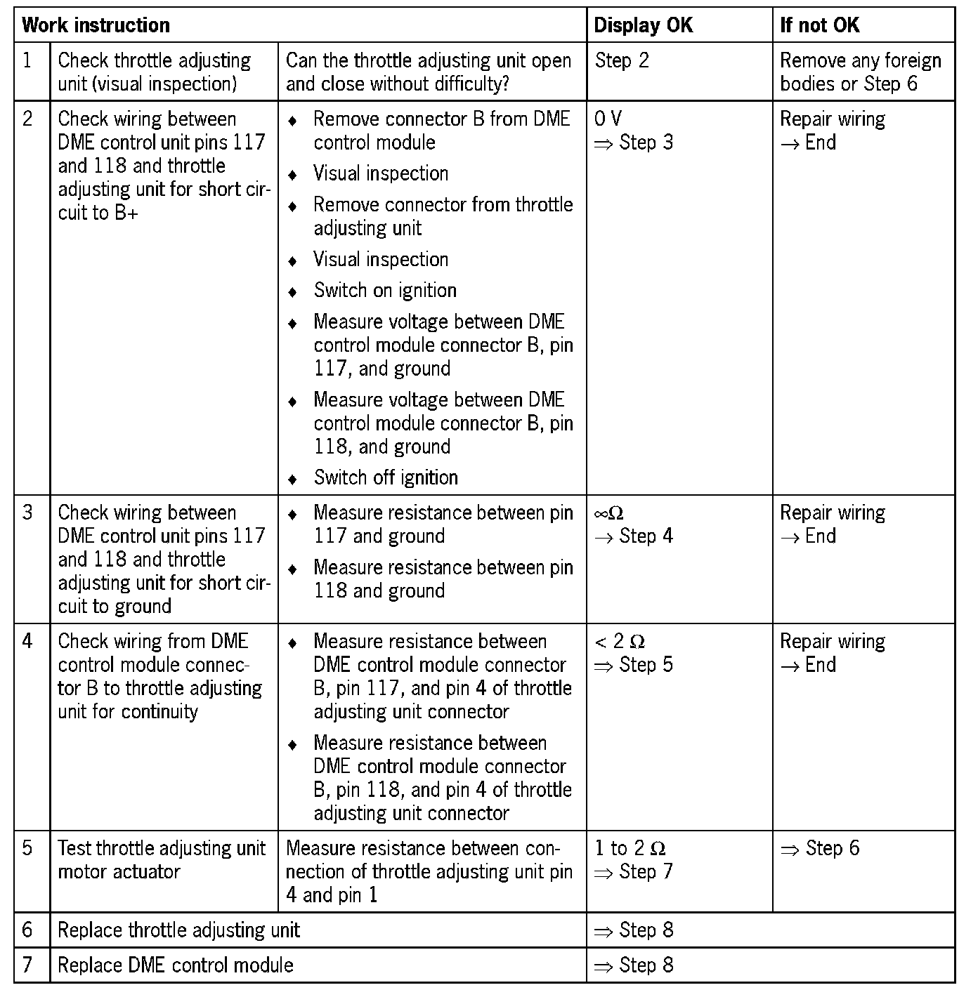 DME control module connector B, pins 117 and 118 and throttle adjusting unit connector, pins 1 and 4