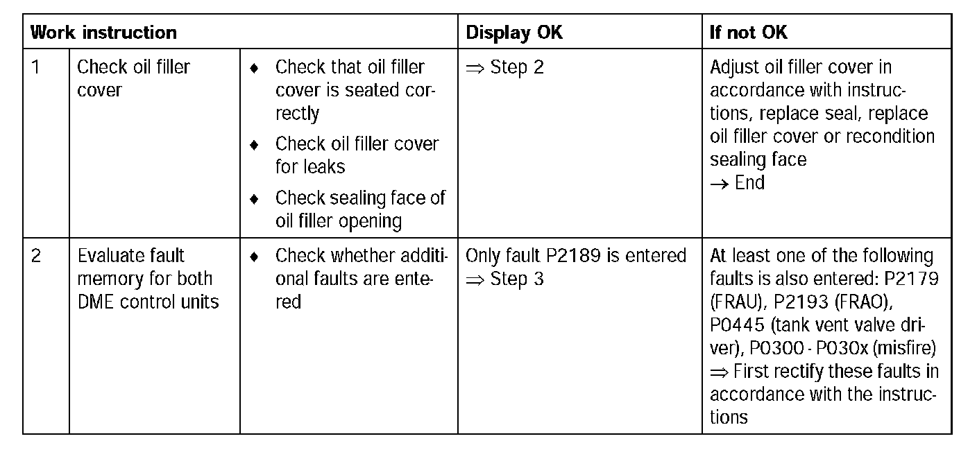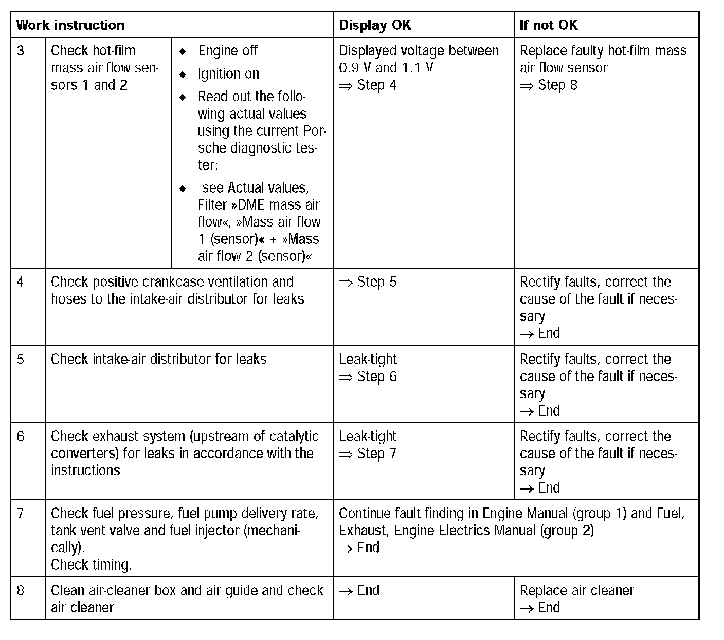 - Hot-film mass air flow sensor 1 and / or 2 faulty (setpoint voltage with stopped engine and ignition on = 0.9 to 1.1 V) --> see Actual values, Filter [[DME mass air flow]], [[Mass air flow 1 (sensor)]] + [[Mass air flow 2 (sensor)]]