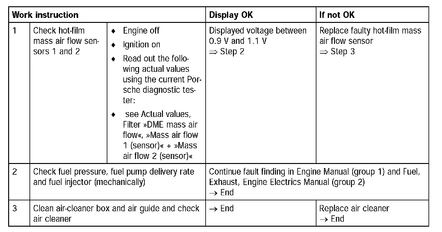 - Hot-film mass air flow sensor 1 and / or 2 faulty (setpoint voltage with stopped engine and ignition on = 0.9 to 1.1 V) --> see Actual values, Filter [[DME mass air flow]], [[Mass air flow 1 (sensor)]] + [[Mass air flow 2 (sensor)]]