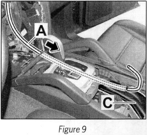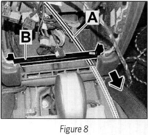 3.1 Route auxiliary line (e.g, Tekalan line) --> Figure 8 -A- in direction of arrow under the transverse strut --> Figure 8 -B- at the right past the selector lever support --> Figure 9 towards the rear --> Figure 10.