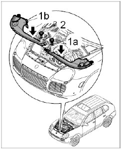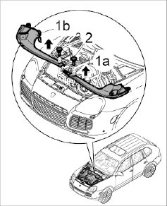 1.1. Insert front trim panel on right and left -1a, 1b- underneath the lid seal and position in engine compartment.