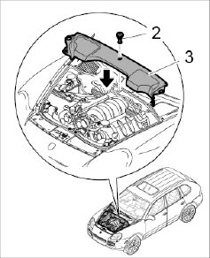 2.1. Insert rear trim panel -3- underneath the lid seal and position in engine compartment.