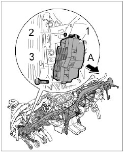 1.2. Pull out fuse box -1- on the driver's and front passenger's side -Arrow A- and tie to the side with connected leads.