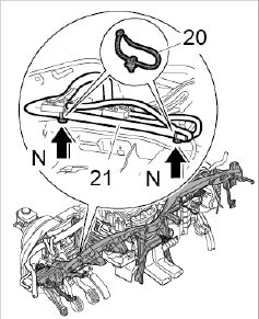 9. Unclip wire harness for instrument cluster -21- at the fixing clips -20- -Arrows N-. Replace damaged fixing clips -20-.