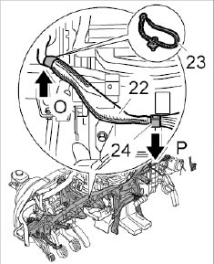 11. Unclip wire harness for PCM -22- at the fixing clips -24- -arrow P-.