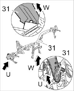 18.2. Pull out bracket -31- upwards over parking brake mechanism -arrow U-.