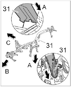 1.2. Insert bracket -31- over parking brake mechanism -Arrow B-.