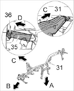 3.1. Unclip wire harness -6- on fastening clip -7- -arrow C-. Replace damaged fixing clips -7-.