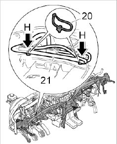 7.1. Clip in wire harness for instrument cluster -21- at the fixing clips -20- -Arrow H-.