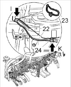 8.1. Clip in wire harness for PCM -22- at the fixing clips -24- -Arrow K-.